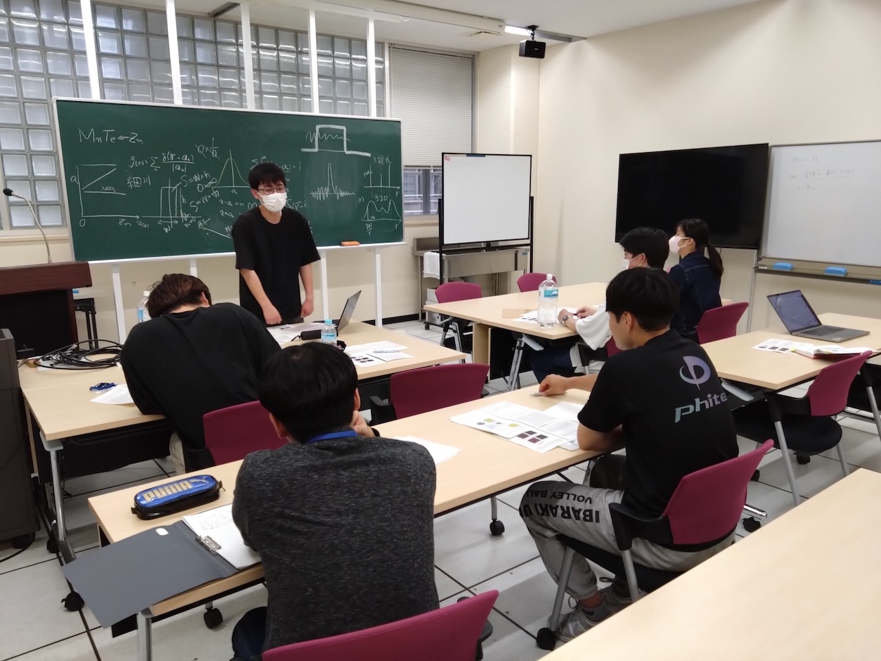 2024年11月19日 M2の會澤君、川上君の修論中間発表会がありました。水戸の理学部物理学科で、他の物性物理学グループの研究室と合同です。<br>