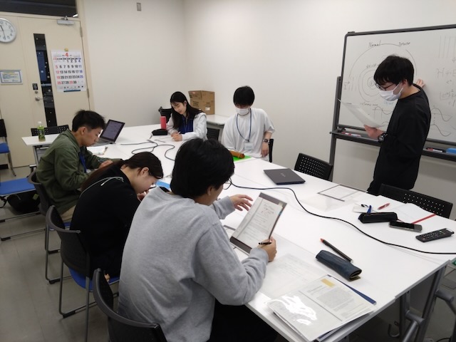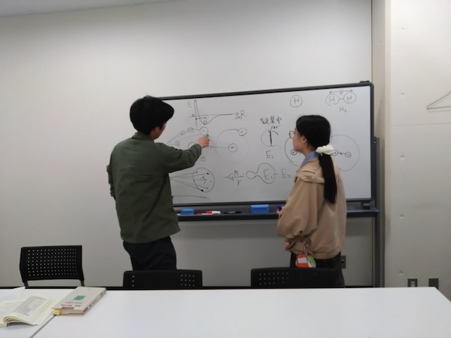 2026年4月20日 4年生の固体物理勉強会です。今日の先生は増子くん。結晶形成での斥力の重要性について勉強しました。